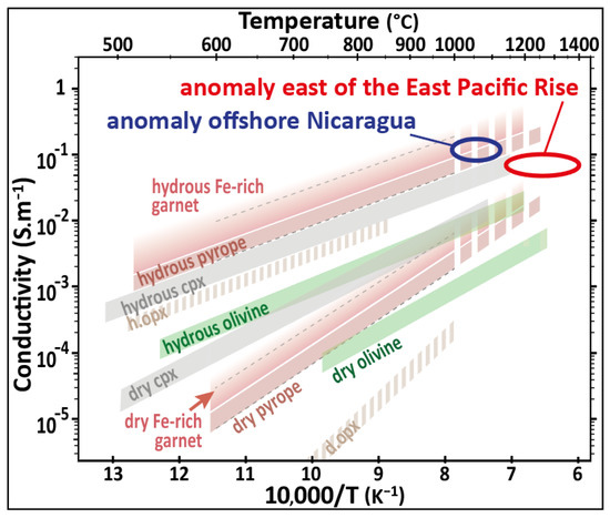 Taking into account that the anisotropic high-conductivity anomaly offshore Nicaragua does not correspond to the LAB but a much colder feature in the middle of the lithosphere (Figure 8), several other candidates could be proposed. The origin of high-conductivity anomalies in the deep lithosphere has been debated for decades [73]. Candidates proposed to interpret such anomalies in the mantle include aqueous fluids [74,75], partial melting [1,76], graphite [60,77], sulfides [77], magnetite-bearing serpentinite [78] and water dissolved in nominally anhydrous minerals or at grain boundaries [28,29,40,51,79,80]. Except for the latter, all the candidates seem unlikely, as discussed in Section 4.3. Contrastingly, hydrous garnet could explain the anomaly.