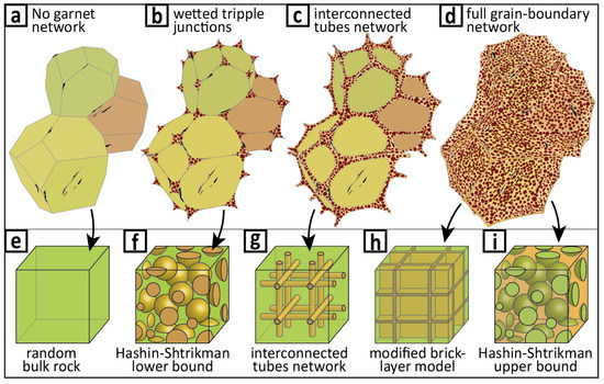 Figure 6. Representation of the different physical models used for electrical conductivity simulations. Sketches of the grains with variable geometries of the garnet networks (ad) and corresponding simplified geometries used for the physical models (ei) presented in Figure 7. Drawings (a,b,d) were adapted from case (c), inspired from [53]. Garnet is represented in dark red, and possible local graphite impurities are represented in black.