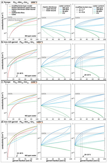 Figure 7. Numerical simulations of electrical conductivity for various amounts of garnet. Physical models illustrated in Figure 6 and additional modeling with a modified Archie’s law [54] (implicit geometrical factors). The formulas are described in Table 1. The simulations are performed for a pyroxenite at 2 GPa (≈60 km) containing (a) natural pyrope at 1000 °C, (b) iron-rich garnet at 1000 °C, (c) natural pyrope at 1100 °C and (d) iron-rich garnet at 1100 °C. In each case, three subfigures are presented, showing simulation results for the different models (left), for the Hashin–Shtrikman upper and lower bounds (center) and the modified Archie’s law (right). The gray shade indicates the data (conductive anomaly recorded using MT offshore Nicaragua) [3]. The high impact of water content is illustrated for the Hashin–Shtrikman geometry and Archie’s law. The impact of water defects on the conductivity of olivine and pyroxenes (values and references in Figure 5) is taken into account (except for the “wetted thin films” and “cubes” models, too simplified if both the conductive network and the less conductive part of the rock are somehow conductive).