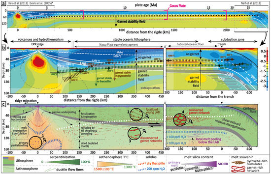 Figure 8. Synthetic cross-section of the Cocos Plate showing the electrical conductivity in the spreading direction, including an equivalent segment from the Nazca Plate. (a) Overview of the electrical structure of the Cocos plate from the EPR to the subduction offshore Nicaragua. (b) Focus on the youngest portion (EPR) [7] with extrapolation * from the Nazca Plate [1] and the oldest portion (subduction) [3]. The hatched lines indicate the depth at which garnet becomes stable in the case of a peridotite (green) and the case of a pyroxenite (brown). The gray dashed lines (beneath EPR) account for melt ascent calculations [21] in cm·yr−1. (c) Geological interpretation based on a review of knowledge up to date (details in Section 4) notably highlighting that conductive minerals could explain the electrical anomalies and that melting is not required. From partial melting beneath the EPR (1), upward segregation, mixing and fractionation lead to passive underplating of pyroxene-rich cumulates and/or intergranular glass intrusions, i.e., fossilized early-stage LAB (2), whereas garnet is stable at higher pressures (3). Furthermore, plate cooling with age [9] leads to the transformation [66] of the refertilized mantle and the formation of garnet-rich connected networks (4). The question mark indicates the interrogation regarding the asymmetry of the electrical anomaly, i.e., ridge migration (discussion in Section 4). Asthenosphere flow lines are adapted from [44]. The thickness of the oceanic crust is ≈7 km on average [67], and the cross-section of Nicaragua is inspired from [68]. * The MT profile from [1] was acquired on another segment of the EPR, i.e., the MELT area, located in Figure 2, between the Pacific and Nazca plates (see discussion in Section 4). In this representation, the LAB is between the 1260 °C and 1300 °C isotherms (Section 3.1), which is a matter of discussion (Section 4.3.4). Legend: LAB = lithosphere–asthenosphere boundary; HAZ = high-anisotropy zone [3].