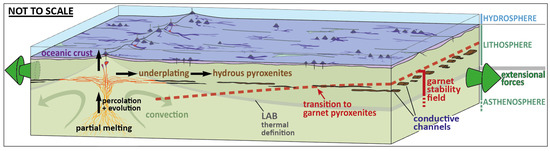 Pyroxenites emplace by underplating at the base of the Ethiopian lithosphere [83], i.e., active rift, which could correspond to the initial stage of oceanization. In the eastern Pacific Ocean, a detailed study of a near-axis seamount chain revealed that seamounts are aligned parallel to the subaxial asthenospheric flow rather than absolute or relative plate motion vectors [70], which supports the underplating mechanism for pyroxenite emplacement into the oceanic LAB. In addition, LAB outcrops would be crosscut by a later generation of amphibole-bearing pyroxenite dykes [49], which suggest that melt emplacement can occur both at the ridge and, somewhat later, off axis. Melt would emplace off axis at depth during lithosphere formation at the ridge or result from the accumulation of a small degree of intraplate melting [16].