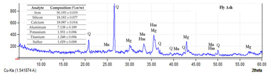 The fly ash was first sieved using a 2-mm sieve screen to remove the large particles. After which, information regarding its elemental and mineral composition was obtained using energy-dispersive XRF and XRD. This is shown in Figure 1. Given the percent composition of silicon and aluminum in the table, the fly ash used could be considered a good aluminosilicate precursor for geopolymerization. Meanwhile, the XRD analysis indicates that quartz (SiO2), mullite (3Al2O3·2SiO2), hematite (Fe2O3), and magnetite (Fe3O4) were present in the fly ash.