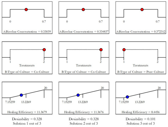 For both factors considered, the healing efficiencies obtained were well above the limit established from the results gathered from the control geopolymers. Therefore, the observed improvements in the properties of the bacteria-containing geopolymers arose because of bacterially induced mineralization and not from the ongoing geopolymerization. Optimization of the two factors yielded a maximum healing efficiency of 11.37% using 0.33 g/mL of biochar and co-cultured bacteria. The solutions are illustrated in Figure 6.