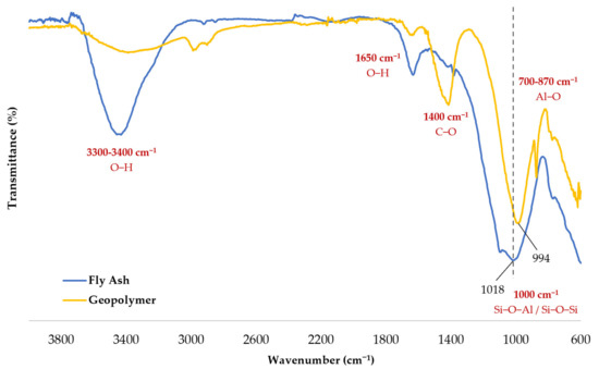 The bond properties of a geopolymer made in this study were studied through FTIR. Figure 7 shows the plots for the fly ash and a representative geopolymer in the study. Shifting can be observed from 1018 cm−1 in the fly ash to 994 cm−1 in the geopolymer. A shift towards a decreasing wavenumber in this region is an indication that geopolymerization occurred [3,24].