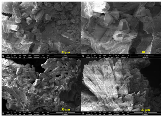 The precipitates in the geopolymer cracks were removed and collected, and an SEM analysis was conducted. The images are shown in Figure 8. The presence of organized and well-defined structures in the sample can be seen. EDX analysis of the sample consistently gave an elemental composition of mainly calcium, oxygen, and carbon, as shown in Figure 9. This highly suggests that the precipitated mineral is most likely calcium carbonate (CaCO3). However, since the self-healing process essentially involved induced mineralization, the inclusion of impurities in their lattice structure and the lack of control over their mineral formation were expected [10]. This is evident from the subsequent FTIR analysis.