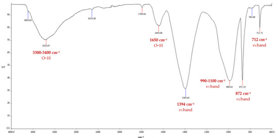 The FTIR spectrum of the precipitates in the geopolymer cracks is shown in Figure 10. Through data matching, the composition was identified to be mainly calcite (CaCO3). The key infrared vibrational bands (υ1–4) of the carbonate ions are shown as well in the figure. It can also be seen in the plot that a broad water band is present. This is an indication that there might be amorphous materials mixed in with the sample. Those materials could be organic ones, such as occluded bacterial cells. As previously stated, this is a common phenomenon for bacterially induced/influenced mineralization. Nonetheless, there is enough evidence to say that the geopolymer cracks were sealed with CaCO3.