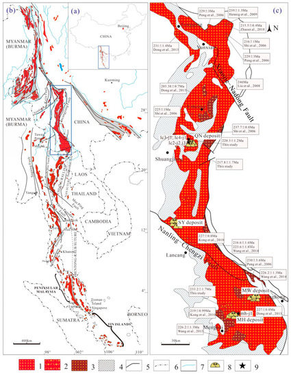The distribution of LC batholith in China (a) and Southeast Asia (b), and regional geology of QN, SY, MW and MH iRee deposits showing the location of the samples (c) (modified from references [33,36]). 1—granite; 2—porphyritic biotite granite; 3—granodiorite; 4—metamorphic rock; 5—fault; 6—national boundaries; 7—river; 8—iRee deposit; 9—Sampled location.