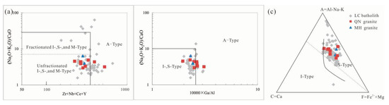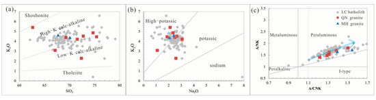 Plots of SiO2 versus K2O (a), Na2O versus K2O (b) and A/CNK versus A/NK (c) for the LC granite (modified from references [37,38,39]; the LC batholith data after e.g., [40,41,42,43,44,45]).