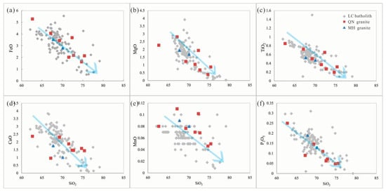 Harker diagrams (SiO2 versus FeO (a), MgO (b), TiO2(c), CaO (d), MnO (e), P2O5 (f)) for the major elements in the LC granite.