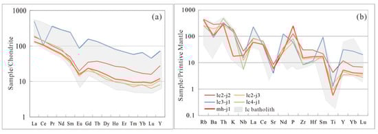 Chondrite-normalized REE patterns (a), primitive mantle-normalized elements diagrams (b) of the LC granite (normalization values after [47]; the LC batholith data after, e.g., [40,41,42,43,44,45]).