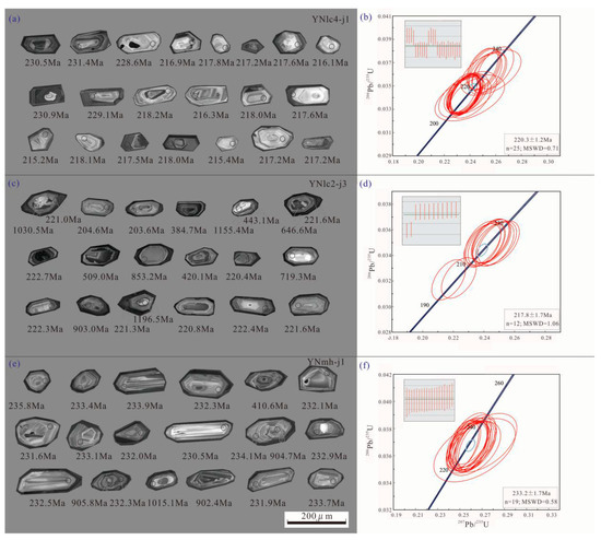 Zircons from the MH biotite granite mh-j1 are similar to the QN zircons and are yellow to colorless, with lengths of 50–250 μm and aspect ratios of 1–4, and magmatic oscillatory zoning in CL images. Their U and Th contents are 98–709 and 16–294 ppm, respectively, with Th/U ratios of 0.18–0.85. One xenocryst analysis yielded a 206Pb/238U age of 410.6 ± 13.2 Ma. Four other xenocryst analyses yielded 206Pb/238U ages of 1015.1 ± 30.0 to 902.4 ± 26.8 Ma, possibly indicating the existence of early Proterozoic basement in the region, similar to that in the Yangtze Block [48,49]. These ages suggest that the petrogenesis of the LC granite was associated with anatexis of crustal materials. The 19 youngest analyses are concordant, with a weighted-mean age of 232.2 ± 1.7 Ma (MSWD = 0.58; Table 3; Figure 8e,f).