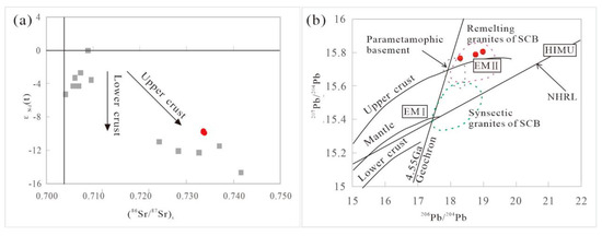 Diagrams of (87Sr/86Sr)i-εNd(t) (a) and Pb-isotopic composition (b) of biotite granite obtained from the LC granite (the LC batholith data after e.g., [41,50]).