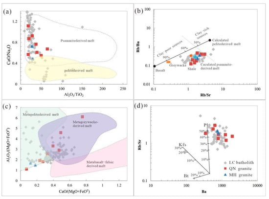 Plots of Al2O3/TiO2 versus CaO/Na2O (a), Rb/Sr versus Rb/Ba (b), Ca/(MgO+FeOT) versus Al2O3/(MgO+FeOT) (c), Ba versus Rb/Sr (d) for the potential magma source of the LC granite (modified from references [54,55]).