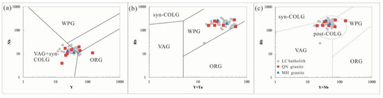 Plots of Y versus Nb (a), Y+Ta versus Rb (b) and Y+Nb versus Rb (a) for the LC granite (modified from references [67,68]).