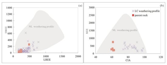 Diagrams of LREE versus HREE (a) and CIA versus REE (b) of the LC granite and weathering profile.