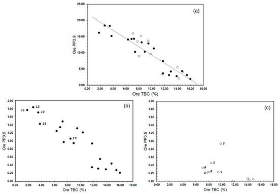 Figure 1. Variability in ore fines (pp3.9%) and ultrafines (pp0.5%) content as a function of bitumen (TBC). (a) pp3.9% versus TBC%. (b) pp0.5% versus TBC% for sample suite 1. (c) pp0.5% versus TBC% for sample suite 2. Open and filled circles represent sample suites 1 and 2, respectively. Numbers refer to the sample numbers listed in Table 1.