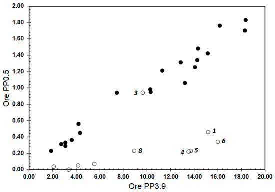 Figure 2. Variability in ore fines (pp3.9%) and ultrafines (pp0.5%) content for both sample suites. Open and filled circles represent sample suites 1 and 2, respectively. Numbers refer to the sample numbers listed in Table 1.