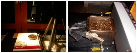 Spectral measurements of froth were acquired for both sample suites. In the initial flotation experiments for the first sample suite (Sp#1–Sp#10), froth was transferred to a glass jar 6 cm in diameter and 2 cm in depth (Figure 3, left photo). A Panalytical FieldSpec FR portable spectrometer (Malvern Panalytical, Malvern, UK) positioned with a nadir view of the froth collected visible and near infra-red (VNIR) spectral reflectance from 0.35 to 2.50 µm (2151 bands). Illumination was provided by a tripod-mounted 50W quartz-halogen light positioned at a 30° incident angle. The footprint of the froth viewed by the instrument was 2 cm in diameter and a spectrum was collected from three to six different footprints. The spectrum of each footprint was collected within one second and consisted of the average of 25 co-adds to minimize signal noise. Each sample spectrum was normalized to that of a SpectralonTM panel (99% reflectance, Labsphere Inc, Sutton, NH, USA) to obtain a reflectance spectrum. The resulting reflectance spectra (4–6 footprints per run, 4 runs) were averaged to provide a single representative spectrum for each froth of the 10 samples. An average reflectance spectrum was also obtained for the froth solids (3 footprints per sample) of each sample following Dean–Stark analysis.