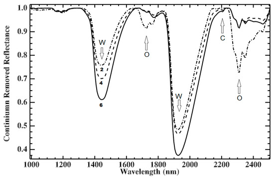 Figure 4. Average point spectra for samples Sp#2, 4, and 6. The spectra are shown with the continuum remove to facilitate the identification of prominent absorption features due to water (W), oil (O), and clay minerals (C). Line patterns: Sp#2 dot-dashed, Sp#4 dashed, Sp#6 solid. Numbers 2, 4 and 6 in the figure are for Sp#2, 4, and 6 respectively.