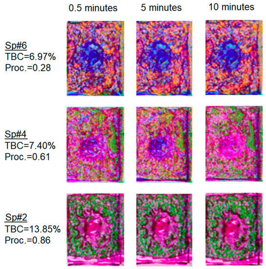 Figure 5. Time series of hyperspectral imagery of froth for Sp#2, 4, and 6, shown as a color composite of 1.2 µm (red), 1.9 µm (green), and 2.3 µm (blue). Froth rich in bitumen is darker green. Imagery is shown at 30 s, 5 min, and 10 min after the removal of the impeller (leaving circular opening in center of froth surface). Total bitumen content (TBC) and processability (Proc.) are listed for each sample.