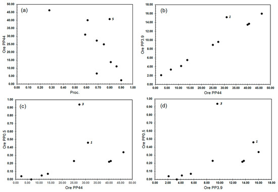 Figure 6. Scatterplots of ore processability (Proc.) and %fines (pp44 and pp3.9) and ultrafines (pp0.5) characteristics of ore. (a) pp44% versus processability. (b) pp3.9% versus pp44%. (c) pp0.5% versus pp44%. (d) pp0.5% versus pp3.9%. Numbers refer to the sample ID listed in Table 1.