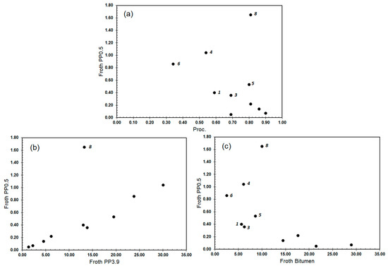Figure 7. Scatterplots of %fines (pp3.9) and ultrafines (pp0.5) characteristics of froth, ore processability (Proc.), and froth bitumen. (a) pp0.5% versus processability. (b) pp0.5% versus pp3.9%. (c) pp0.5% versus bitumen%. Numbers refer to sample ID listed in Table 1.