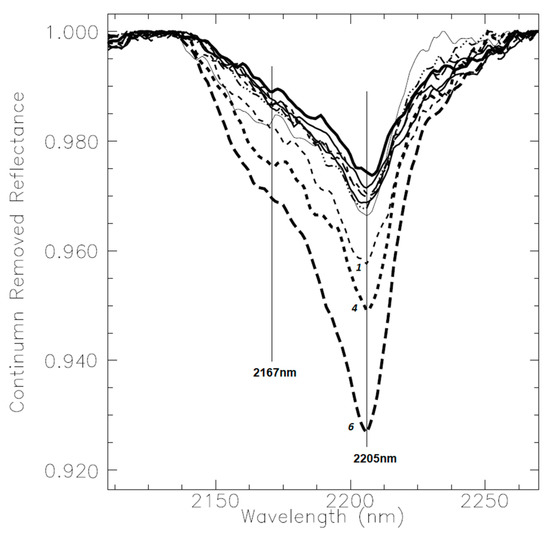 Spectral features diagnostic of two groups of clays can be seen in the spectra of froth and of froth solids (Figure 8) after the removal of the continuum to highlight the absorption features of kaolinite and illite-smectite clays centered, respectively, at 2167 and 2205 nm. The spectra of the froth solids display a broad feature centered at 2205 nm but with considerable asymmetry, reflecting the contribution of lesser amounts of kaolinite, whose absorption is at a shorter wavelength. These spectra represent mixtures of both clay types across all samples. Samples Sp#6 displays the strongest absorption, followed by Sp#4 and 1, consistent with a high froth fines content in these samples, with the first two having the highest fines content. The spectra of the remaining samples form a tight cluster.