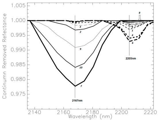 The spectra of froth (Figure 8 bottom frame) are quite distinct from those of froth solids, in that two clear spectral signatures are visible—namely, samples whose spectrum is dominated by the spectral feature of kaolinite near 2167 nm and those dominated by the feature of illite-smectite near 2205 nm. This suggests the segregation of clays during the flotation process. Samples displaying the most pronounced kaolinite feature are Sp#7, 10, 9, 2, and 3 (in order of decreasing absorption strength), all displaying green froth imagery (Table 3). Samples displaying the most pronounced illite-smectite feature are Sp#6, 4, 1, 5 and 8 (in order of decreasing absorption strength), all displaying red froth imagery (Table 3). Figure 9 is a color composite designed to highlight the relative abundance of these two groups of clays with samples having a predominance of illite-smectite clays in the froth displaying red color imagery (decreasing intensity for Sp#6, 4, 1, 5, and 8). These results are consistent with those of Wallace et al. [14], who linked the increased abundance of degraded (de-potassified) illite, leading to a build-up of froth solids, to ores that processed more poorly.