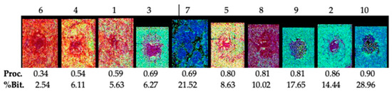 Froth imagery presents sample-to-sample variability, as seen at the end of Table 3. To understand these changes, key ore and froth characteristics and imagery are arranged in order of increasing sample processability. The imagery is a composite enhancing the strength of bitumen features at 1750 and 2350 nm and solids (e.g., clays at 2205 nm, Figure 4) where green conveys highest abundances in bitumen and red highest abundances in solids. There is a general trend from red to green imagery with increasing sample processability—e.g., samples Sp#6, 4, and 1 with lowest processability (<0.6) showing red imagery and samples Sp#9, 2, and 10 of the highest processability being green. However, the imagery of Sp#5 and 8 stands out.