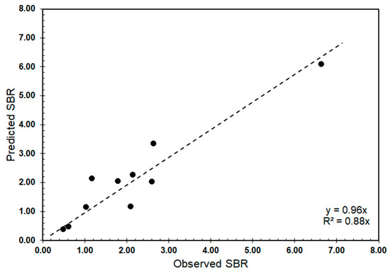 The model predicting solids to bitumen (Equation (1)) involves four features. The RMS (root mean square) error for the model is 0.55 for the modeling suite of 10 samples. When the observed SBR value is compared to the predicted value for the ten samples (Figure 10), a best fit line through the data displays a slope of 0.96, which indicates that the prediction model is unbiased.