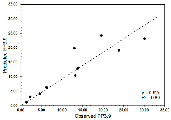 The models predicting the fines and ultrafines content (Equations (2) and (3)) involve three features. The RMS (root mean square) errors for these models are 3.86 and 0.06 for the modeling suite of 10 samples. Figure 11 and Figure 12 compare the predicted and observed values of pp3.9 and pp0.5. The comparison reveals less data scatter for the pp0.5 predictive model and a higher r2 (0.9 vs. 0.8).