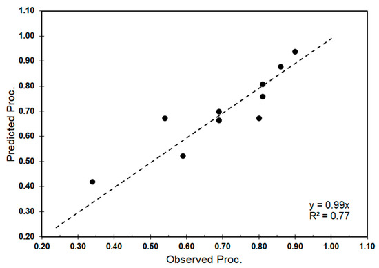 Figure 13. Scatter plot of the observed and predicted processability. The dashed line represents the trend line.