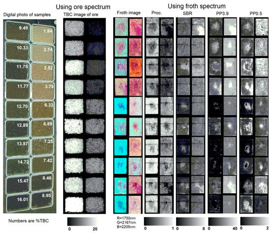 The predictive models enable the conversion of froth imagery into image maps of a given froth parameter and the comparison of such imagery across a series of parameters as well as across a sample suite (Figure 14). The processability predicted from froth spectra generally follows the trend in measured processability (Table 3), though samples Sp#5 and 8 are underpredicted and the pattern seen resembles that in the color composite. This is consistent with a high froth solids and spectrally inferred fines and ultrafines content in these samples. The imagery of SBR follows the measured pattern in froth solids with sample Sp#6 being very high, Sp#7 very low, Sp#2, 9 and 10 being low and then the remaining samples. Sample-to-sample patterns in pp3.9 froth imagery appear similar to those seen for SBR.