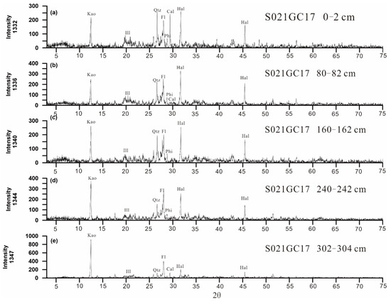 (a–e). X-ray powder diffraction patterns of bulk sediment samples from different depths. Kao = kaolinite; Ill = illite; Phi = phillipsite; Qtz = quartz; Fl = feldspar; Cal = calcite; Hal = halite.