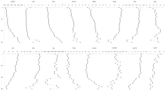 The total REY concentrations in samples from the Yupanqui Basin ranged from 1057 to 1882 ppm (average 1329 ppm), gradually increasing with depth. The CaO, P2O5, Fe2O3, and MnO contents obtained for the REY-rich muds show positive correlations with depth, whereas the Al2O3, TiO2, and K2O contents either show no correlation or negative correlations with depth (Figure 4). The ∑REY co-vary positively with CaO, P2O5, Fe2O3, and MnO, and negatively with Al2O3, TiO2, K2O, δCe (CeN/(LaN × PrN)0.5), and δEu (EuN/(SmN × GdN)0.5) (Figure 5). There is no change in the REY patterns of the sediments with the increasing depth. The REY-rich muds have HREE-enriched patterns on Post-Archean Australian Shale (PAAS)-normalized REE diagrams. All of the samples show depletions in Ce, and positive anomalies in Eu and Y (Figure 6a). In contrast, on seawater-normalized REE diagrams the samples show light rare earth elements (LREE) enriched patterns and positive anomalies in Ce and Eu (Figure 7a).
