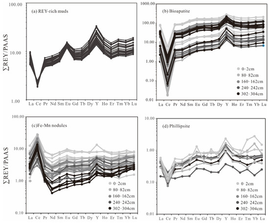 Post-Archean Australian Shale (PAAS)-normalized REY patterns for (a) REY-rich muds, (b) bioapatite, (c) Fe-Mn micronodules, and (d) phillipsite. Normalizing values are from [31].