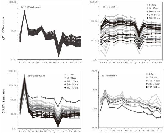 Seawater-normalized REY patterns for (a) REY-rich muds, (b) bioapatite, (c) Fe–Mn micronodules, and (d) phillipsite. Normalizing values are from [32].
