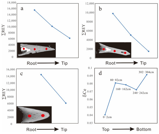 The CaO and P2O5 contents of REY-rich muds in the Yupanqui Basin show positive correlations with ∑REY (Figure 5), which suggests that a Ca-phosphate phase is the dominant carrier of REY. The average REY content of bioapatites fossils from the Yupanqui Basin is 9123 ppm (with 8921 ppm exclusion of Ce), which confirms that bioapatite is the main REY carrier. The bioapatites are typically fish teeth, and their REY concentrations decrease significantly from the tooth roots to the tips, suggesting that the REYs enter through the roots and diffuse to the tips (Figure 8a,c). This occurs because the dense enamel that coats the bioapatite hinders REY incorporation. REY can only diffuse through the breach at the root, leading to the observed REY gradients [16].