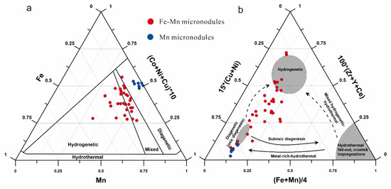 To clarify the genetic type of micronodules, their elemental contents of Mn, Fe, Co, Ni, and Cu were plotted on a ternary discrimination diagram (Figure 9a) [41]. Most of the Fe-Mn micronodules fall into the hydrogenetic and mixed-type fields, whereas the Mn micronodules plot in the diagenetic field, which indicates the co-existence of different genetic mechanisms. Most of the micronodules plot in the transition area between the hydrogenetic and diagenetic fields, and the diagenetic-type (Fe)-Mn micronodules cluster mainly in the oxic diagenesis area on the 100 × (Zr + Y + Ce) vs. 15 × (Cu + Ni) vs. (Fe + Mn)/4 diagram proposed by Josso et al. [42] (Figure 9b). The average REY content of Fe–Mn micronodules is 1586 ppm (with 490 ppm exclusion of Ce), and the average REY content of Mn micronodules is 567 ppm (with 222 ppm exclusion of Ce), which indicates that hydrogenetic micronodules can release REY during the early stages of diagenesis. Given the high proportion of Fe–Mn micronodules in the sediments (15%), they contribute as much as 22.5% of the REY content of the sediments. Considering Ce is the least valuable element in REY, the economical values of micronodules in the sediments represent a significant discount.