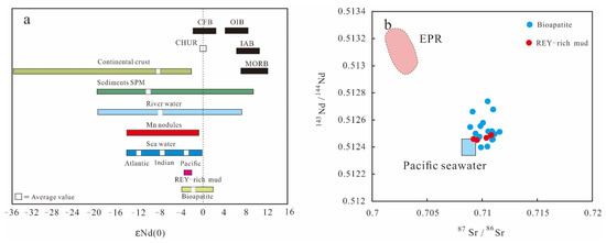 (a) Comparison of εNd(0) values in the REY-rich muds and bioapatites with various sources. (b) Plot of (87Sr/86Sr) vs (143Nd/144Nd) for the REY-rich muds and bioapatites. Natural variability of the Nd isotope composition in different rocks, sediments, and waters, given εNd(0) values relative to CHUR, modified after [59]. Mid-oceanic ridge basalts proposed by [60]. River water and river sediment εNd(0) values after [61,62]; seawater εNd(0)values for the different ocean basins after [63] and [64]. CHUR = chondritic uniform reservoir; CFB = continental flood basalt; OIB = ocean island basalt; IAB = island arc basalt; MORB = mid-oceanic ridge basalt. EPR/Chile Ridge field proposed by [65].
