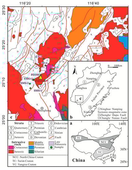 The Zijinshan area is located in the southwestern Fujian Provence (Figure 1b), China (Figure 1a). The northwest-striking Yunxiao-Shanghang fault zone and several northeast-orienting Xuanhe anticlinoria are the chief ore-controlling structures. Flysch sediments metamorphosed by the Sinian and early Paleozoic periods are outcropped in the Zijinshan area (Figure 1c). The Indosinian orogeny, which occurred in the eastern part of China during the early Triassic, resulted in a change in the tectonic framework in Southeast China from the predominantly Tethys tectonic domain to the circum Pacific active continental margin [25,26,27,28]. The orogeny formed a series of intermediate-acid igneous rocks accompanied by large-scale mineralization [25].