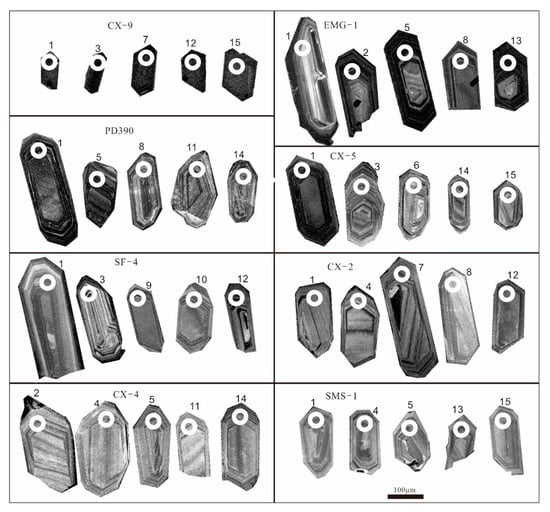 The analyzed zircons were mostly colorless and transparent crystals, ranging from semi-automorphic to idiomorphic, with a length of 100–400 μm and varying length/width ratio from 1:1 to 4:1. The CL images clearly showed that the internal structure of the zircons was oscillatory zoning (Figure 3). No influence of alteration on these zircon grains was observed. The Th/U ratios of the zircons were generally >0.1 (Supplementary Table S1), which is typical of magmatic zircons [41].