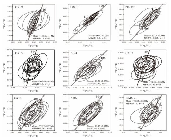 Fifteen analyses on zircon grains from sample CX-9 yielded concordant 206Pb/238U dates ranging from 136.9 ± 2.0 to 141.2 ± 2.1 Ma with a weighted mean age of 138.8 ± 1.1 Ma (MSWD = 15; Figure 4). Zircon samples from EMG-1, PD-390, and CX-5 displayed a weighted mean age in the range of 109.2–107.4 Ma. They yielded concordant 206Pb/238U dates ranging from 103.7 ± 1.6 to 118.2 ± 1.4 Ma, except for one (EMG-1@13) that was 153.0 ± 2.3 Ma. Zircon samples from SF-4, CX-2, CX-4, SMS-1, and SMS-2 displayed a weighted mean age in the range of 99.7–98.2 Ma, with concordant 206Pb/238U dates ranging from 103.9 ± 1.5 to 96.5 ±1.5 Ma. Two xenocrystic zircons had ages of 224.8.0 ± 3.3 Ma (SF-4@13) and 755.6 ± 10.7 (SMS-2@13).