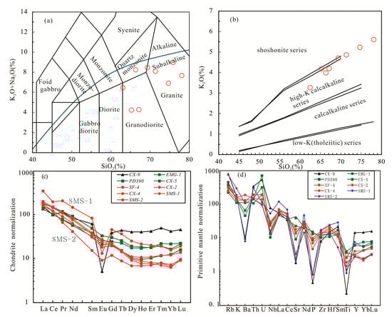 Geochemical classification diagrams of porphyritic rocks from the Zijingshan area. (a) TAS (Total Alkali vs. Silica) diagram; (b) K2O versus SiO2 diagram; (c) standardized rare earth element; and (d) incompatible trace element diagrams.