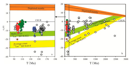 As Cretaceous porphyritic rocks play an important role in mineralization, much attention has been paid to their genesis [14,17]. However, as the magmatic rocks in the Zijinshan area were usually subjected to intense alteration, it is difficult to completely describe the characteristics of the original magma from a whole-rock geochemical study. Even though zircon Hf isotopes have been conventionally used to study the origin of these rocks [4,10], the large range of Hf isotopic compositions from various mantle sources sometimes prevents the effective identification of the magmatic source and, thus, the genesis of the economic ore deposits.