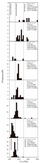 The detailed dating results are listed in Supplementary Table S1. Because of errors in counting statistics during the analysis, the 207Pb/206Pb ages were more accurate for older (>1 Ga) zircons, whereas the 206Pb/238U ages were more accurate for younger zircons [42]. Therefore, we use the 206Pb/238U ages for younger zircons in the following discussion.