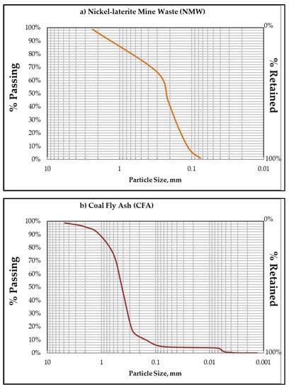 Particle size distribution (PSD) of (a) nickel–laterite mine waste and (b) coal fly ash.