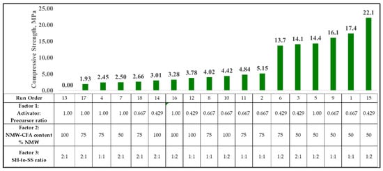 The unconfined compressive strengths of the synthesized geopolymer were observed to range from 1.93 MPa up to 22.14 MPa after 28 d (Figure 4). The experimental formulation mix number 15 with an activator-to-precursor ratio of 0.429, 50% NMW, and with SH-to-SS ratio of 1:2 yielded the highest value making it the best mix sample among other runs. The sample with an activator-to-precursor ratio of 1, 100% NMW with 2 parts of sodium hydroxide and 1-part sodium silicate (SH-to-SS ratio of 2:1) resulted in deflocculation of NMW; hence it did not harden. This result is due to the following: (1) the precursor is made from 100% NMW, which is not that reactive as CFA; (2) the high ratio of SH-to-SS and low reactive Si and Al content of NMW resulted in excess amounts of NaOH and water. Additional water generally improves the workability of the geopolymer paste made from a precursor with high water holding capacity such as NMW. However, the excess water content can cause a dilution effect, which affects the geopolymerization and, consequently, the number of active components that can be mobilized []. It was also observed that the higher viscosity of concentrated NaOH solution hindered the evaporation of excess water. This result means that the geopolymeric paste needs more time or higher curing temperature to gain better or full strength [,].