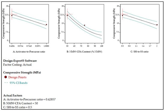 All three factors significantly affect the compressive strength of the synthesized geopolymer based on ANOVA (Table 8). Representative plots of the relationship of individual factors with their compressive strength are shown in Figure 5. All factors namely activator-to-precursor ratio (A), percentage NMW (B) and SH-to-SS ratio (C) show the same effect to the compressive strength which increases as individual factor decreases.