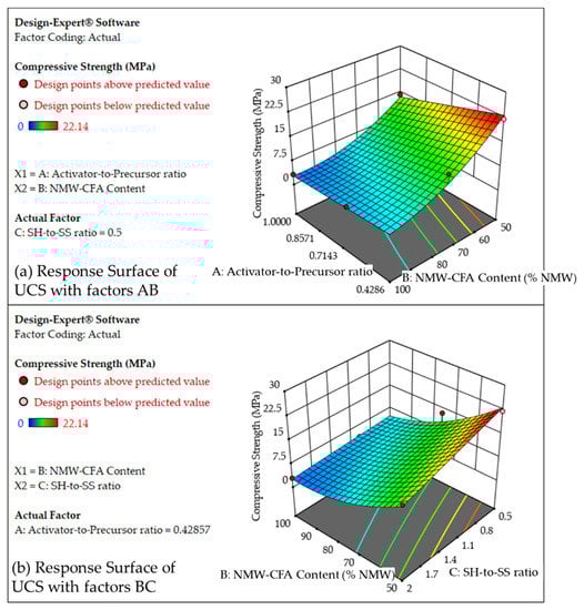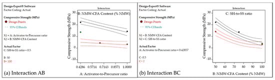 Figure 6 shows the interaction graph of AB and BC. The interaction of factors A (activator-to-precursor ratio) and B (% NMW) shows that the compressive strength increases as both factors decrease (Figure 6a). The interaction AB shows that the trend of compressive strength is affected when %NMW (B) is changed from 50% to 100%. At 100% NMW, the change in compressive strength is less obvious when the activator-to-precursor ratio (A) is changed. Decreasing the % NMW (B) corresponds to the increase of CFA content in the system, in which CFA is more reactive for geopolymerization. Moreover, when the activator-to-precursor ratio (A) decreases, a higher precursor amount is present in the system. When the amount of precursor is increased, the geopolymerization reaction is boosted because of the high reactivity of CFA, increasing the compressive strength of the product. Similarly, Figure 6b also shows the interaction of factors B (% NMW) and C (SH-to-SS ratio) that compressive strength also increases as both factors B and C decreases. The interaction BC shows that when SH-to-SS ratio (C) is increased from 0.5 to 2, the trend of the compressive strength decreased slowly when % NMW (B) is increased from 50% to 100%.The possible explanation for this is that when % NMW is decreased, more CFA is present in the system. This interaction can be further explained by the mineralogy of the precursors. The XRD of the NMW shows that it has less active aluminosilicate components than CFA. Thus, increasing the amount of CFA in the precursor mix improves the reactivity and influence the compressive strength of the final geopolymer mixture. Moreover, when SH-to-SS is decreased, it means a high value of SS (Na2SiO3) is present. The SH may have easily dissolved the reactive aluminosilicates in both the NMW and CFA, so less hydroxide is needed before the geopolymerization process. Thus, SS is considerably needed as a binding source and promoter of hardening [].